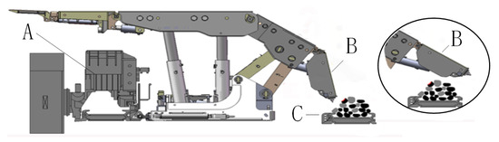 Top-coal caving process. A: Shearer, B: Tail boom of a hydraulic support, it acts as a window open and close. C: Drag conveyor. When the window is opened, the top-coal will collapse and be captured by the drag conveyor. In the sub-graph, the window is closed to prevent the rock falling down.