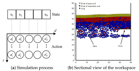 Simulation platform of top-coal caving. In (a), The , , respectively, denote the state and action of agent i on the time point t. In (b), a number of rock and coal particles distribute randomly in the boundary of rock and coal. Our aim is to obtain the maximum coal with minimum rock by opening and closing the windows.