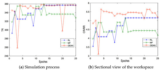 The TR of test during the model learning are shown in Figure 3a. As we can find out that the TRs increase with the learning process. The RL and OEAN can obtain the highest TR after 15 epochs learning. The OEAN swaying at the end, especially, in 20 epoch, there is a singular point. Although the imperfection of the swaying, the OEAN can obtain the perfect performance in top-coal caving, shown in Figure 3b, and the RR is lower with greater CR.