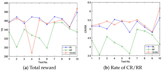 According to Figure 5a the TR of RL and OEAN can approach a high level, and in Figure 5b, the rate of CR to RR shows that OEAN could obtain the most performance of top-coal caving. Especially in the Tests No. 1, 3, 6, 9, and 10, the total reward and rate of CR to RR are the best if the OEAN is employed. That indicates in those tests, the OEAN method could obtain the global optimal decision. In the other tests of adopting the OEAN, although the total reward cannot approach the optimum level, the rate of CR to RR is the best. That means the OEAN method can obtain a better pose between the coal recall and rock ratio in the top-coal caving.