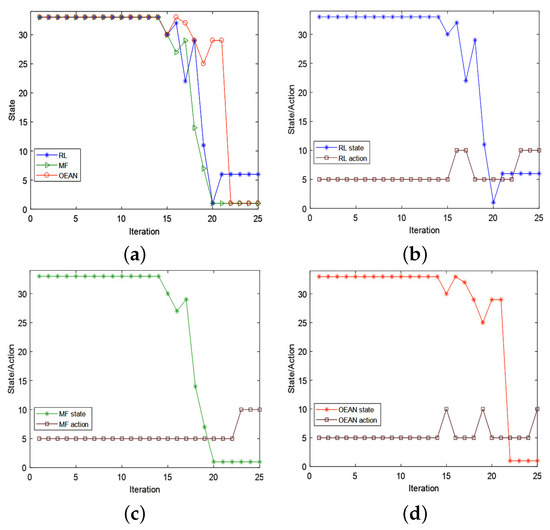 Tests result with the random location of the rock particles in the coal layer. (a) is the states of three methods. (b) is the states and actions of RL. (c) is the states and actions of MF. (d) is the states and actions of OEAN.
