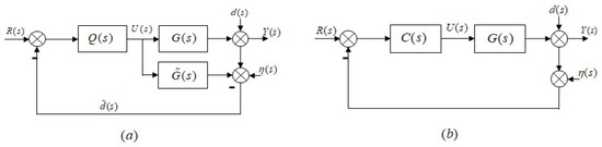 The basic scheme of the IMC is depicted in Figure 3 together with the classical control scheme, where is the process, the process model, the controller, the reference signal and, and the output perturbation and measurement noise signals, respectively. An important fact is that under this scheme, is an estimated effect of the perturbation and noise.