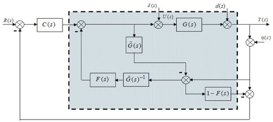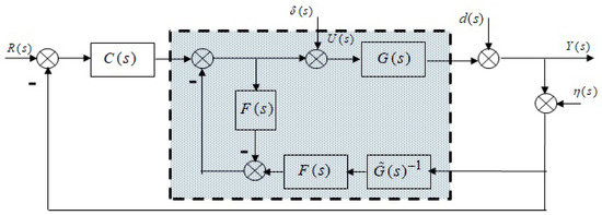 An immediate consequence of the IMC controller is the DOB described in Figure 5, where , and are the input perturbation, output perturbation, and measurement noise, respectively; , , , and are the feedback controller, process, process model and a low-pass filter, respectively. The DOB is a control scheme designed to compensate plant uncertainty and output perturbation reduction in conjunction with a feedback controller. Comparing the evolved scheme of the IMC of Figure 4 with the DOB scheme, it is clear that the DOB exploits the same idea of the IMC of plant cancellation plus a low-pass filter separating the disturbance reduction––by means of its observation—from the control action. In Figure 5, the shadowed block represents the DOB. Like IMC, the low-pass filter and the inverse of the plant model are defined as in Equations (15) and (16).