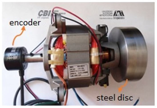 It is necessary to design and implement a power driver capable of inverting the polarity of connection of the voltage supply to the motor to allow the possibility of reverse motion in a series DC motor. This requires electronics with safety circuitry, in addition to the implementation of sensors (current and rotor position) and data acquisition electronics are required to achieve real-time monitoring and control. The design of the power driver was based on the monophasic universal motor from the Koblenz model HC8825M110 with a couple loads of a steel disc of 0.920 kg, nominal maximum speed and power of 24,000 RPM and 0.815 HP, respectively. Current consumption of 0.88 A in steady-state and up to 3.3 A at start up. Also, for sensing the position, speed, and direction of the rotation of the rotor, an incremental encoder of 1024 ppr was installed (see Figure 7).