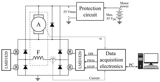 The most important block is the power electronics stage (Figure 9, Block 1) which provides the necessary energy to operate and invert the direction of motion of the motor according to the controller requirements. This circuitry is able to withstand reverse currents when the motor slows down or when the controller demands a change in the direction of rotation. To achieve reverse direction of rotation, it is necessary to reverse the magnetic flux of the field winding. This is done by connecting the field coil in an “H-Bridge” build with the integrated circuit LMD18200 which includes 4 MOSFET transistors [47,48]. The transistor commutation reverses the current direction passing by the field with respect to the armature with which the magnetic flux and the direction of rotation are also reversed. The maximum operating voltage of the power stage is 50 VDC which are supplied by a laboratory voltage source. In Figure 10 the schematic diagram of the power stage is shown.