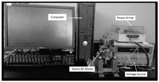 The appropriate design of speed control systems for this kind of motor will surely increase its use and application by better exploiting of its great features—high torque, low current consumption, and small dimensions—all desirable characteristics for electric motors employed as actuators. In particular, these features are required by robotics where low weight, small dimensions, and low current consumption with high torque are highly appreciated. Another possible application for these electric motors is their use in electric vehicles [1,2,3], where high torque with low current consumption is required. The former requires accurate models (linear and nonlinear), proper power drivers and good control schemes. The authors define good control schemes not only by their robustness and performance but by their level of complexity which can impede or facilitate its design and implementation. In a previous article [4], a methodology for the identification of series DC motors based on a nonlinear model without magnetic saturation together with a linearization around an equilibrium point was presented. Moreover, in [4] it is shown that linear models in the form of transfer functions are good models in the design of high performance controllers for a large range of operations. Moreover, in [5], the design of the nonlinear generalized predictive controller for series DC motors showed that this kind of motor has a non-well defined relative degree in conditions where the current or the rotor speed is zero, so exact linearization cannot be obtained if reverse motion is required. Due to this characteristic, some early reports and articles published, regarding the design of speed control systems for series DC motor, are devoted to using the series DC motor model as an academic example to analyze, design and assess different control strategies for systems with a non-well defined relative degree [6,7,8], or to assess control approaches—nonlinear, linear, fuzzy logic, fractional—without considering reverse motion [9,10,11,12,13,14,15,16]. Moreover, most of them are limited to validations based on digital simulations. On the other hand, articles reporting real-time implementation focus mainly on the power driver without inverting motor polarization [17,18,19,20,21,22]. The authors are aware of only one attempt to implement a speed control system for a series DC motor, including necessary electronics to generate reverse motion but, regrettably, with unrealistic current consumption of around 150 A [23]. Therefore, this article represents a novel result for the speed control problem of series DC motor.