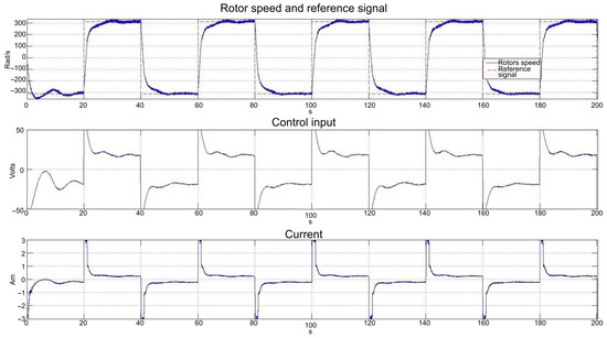 In Figure 21, the response to a reference signal given by a train of square pulses with amplitude and frequency = 150 rad/s shows that the power driver is capable of inverting motor polarity, so inverse motion—inverse torque—is achieved. Also, the effects of the sensor noise were highly reduced by the NRDOB, compared with those reported in [4], reducing control efforts. Moreover, the PI controller with the “anti-windup” scheme satisfies the conditions of design with very low current consumption. It should be noted that the peaks present in the control input and current are due to the extremely demanding sudden changes in .