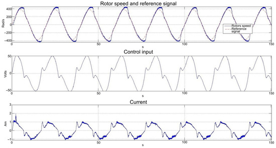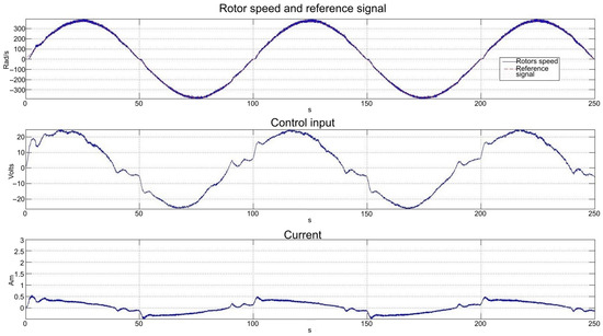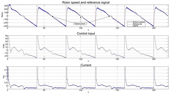 The responses to a “sawtooth” reference signal are shown in Figure 24, apart from allowing the assessment of the NRDOB_PI and the power driver to tracking a ramp-like signal, inversion of the direction of rotation and noise filtering, it exposes the “dead zone” of the series DC motor, due to inertias and friction present in many electromechanical devices. In spite of this highly non-linear characteristic, it does not deteriorate significantly the performance of the control system.