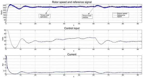 This final experiment seeks to assess NRDOB_PI control system under unknown load perturbations. The unknown load perturbation was applied at t = 30 s and released at t = 60 s when the reference signal is given by the constant = 320 rad/s. As shown in Figure 25, control input (input voltage) shows an increment at t = 30 s to approximately 30 V, and a decrement to its previous value, before the perturbation injection, of around 20 V at t = 60 s. The same occurred with current consumption without a significant increment as its value remains below A, Therefore, as expected, the control system was able to reject the perturbation.