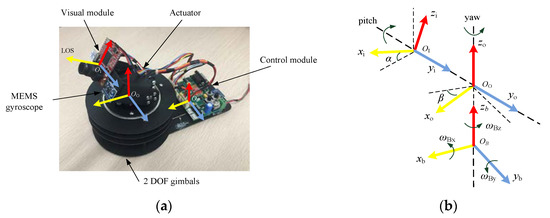 The VTISP consists of the dual-axial gimbals, visual sensor, and MEMS gyroscope. Angular velocities in pitch and yaw gimbals are controlled by gear-driven actuators. As shown in Figure 1a, the plant designed for testing is a VTISP with the same principles as others. Theoretical models and variable definitions in the VTISP are as follows.
