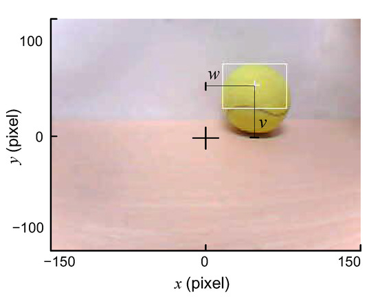 The inner loop input variable ω0 has been calculated by s0–s, where s0 is the pixel of the location set in the FOV. The vector is s = (w, v)T, in which w and v are the feedback variables for the visual loop. To achieve a visual tracking function, the system keeps w = 0 and v = 0.