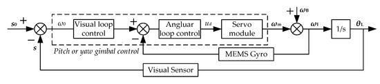 The VTISP control system is consists of an inner angular velocity loop and an outer visual loop. The angular velocities of the pitch and yaw gimbals are detected by the MEMS gyroscope, the data of which are the angular velocities in inertia as the feedback of the inner loop [39,40]. When the motions ωB from the base vehicle are introduced to the platform, the LOS can keep stable in inertia by the inner angular velocity loop. Visual tracking is achieved by adding an outer visual loop when the target is identified by the visual sensor, which can feedback values to vector s, so that the errors between the target and the center of FOV are identified.