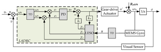 The LADRC is introduced to the VTISP control system, as shown in Figure 4, which illustrates a pitch gimbal scheme such that Ry = (−sinβ, cosβ, 0).It is a control method to estimate and compensate for the total disturbance in the system, which includes external disturbance, model inaccuracy, and coupling. It is a dynamic process that does not utilize system parameters and specific models but uses the information between the inputs and outputs of the system to eliminate the disturbance in the system directly. The total disturbance is estimated by the linear extended state observer (LESO) from a simplified model and the output signal of the sensors, which can be compensated before generating the influences on the plant. The purpose of the method is to improve the performance in the dynamics and stability in the system. The LADRC consists of a tracking differentiator (TD), the proportional differential (PD) controller, and the LESO [41]. The TD can track the input signal and provide the smoothed high-order signals without the overshoot. It has almost the same performance as that of the PD but is easier to implement in practice than the nonlinear state error feedback (NLSEF) in the traditional ADRC. The LESO is modified by the TD, as shown in Figure 4, and discussed in detail as follows.