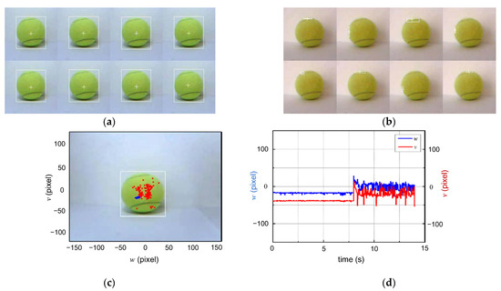 The influence of identification by luminance variation is shown in Figure 5, where the center of the identified field is stable in the view of the target in a lighting environment, marking a contrast to Figure 5b, which is unstable in darkness. The trajectory of the center of the identified field in the light and dark is shown in Figure 5c. Then, the signal of the miss distance to the center of view by the visual sensor is shown in Figure 5d, from the light to dark environment at 8 s. The random disturbance in the identification can be defined as n(t), where the relation in bound is |n(t)|≤dv, dv = 50, where dv is the radius in pixels of the target in the FOV. It is simplified in the visual model so that the distance between the target and the visual sensor cannot be regarded in the luminance variation conditions.