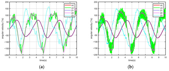 The observed variables of LESO with state data from MEMS gyroscope. (a) 10 Hz; (b) 0.1 kHz.