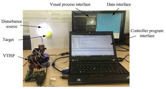 To validate the superiority of the LADRC controller, experiments have been customized by a VTISP with a data acquisition system. It contains the VTISP, and a computer with a development and test environment, target, and light source for disturbance, as shown in Figure 8. The major constituent and parameters of the VTISP are shown in Table 1 and Table 2. Visual processes and tracking systems are implemented by the DSP in H7 and F4 series of ST microelectronics, which are programmed by the Python and C languages. The parameters turned in the program are shown in Table 3. Experiments are designed in comparison between the SMC and LADRC controller, referring to the performance when the illumination disturbance is induced into the system.