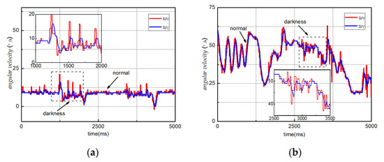 To validate the performance of the TD in random disturbance rejection, the visual loop is test-independent. The control signal ud is disconnected fromthe actuator to set the LOS in a fixed angular position. The value ω0 is the variable of the vector s0 − s that expresses the pixel errors from the center of the FOV in the yaw motion. The output of the TD is ω1, such that the order of the angular velocity acts as the input variable of the PD. As shown in Figure 9a, the target is static at 10 pixels in the yaw. During the time 1.2~2 s and 3~4.5 s, the disturbance in the identification is induced to ω0 by a dark environment. The time integration is employed instead of the overshoot, as shown in the small diagram, making the following inner velocity loop stable. Then, the target motions in the FOV and the illumination are darkened during the time 1.75~4 s, as shown in Figure 9b. As shown in the small diagram, it is indicated that the overshoot introduced by the varying illuminations in ω0 is smoothed by the TD algorithm. Therefore, we can conclude that the TD has a satisfactory smooth performance in tracking the input signal to identify disturbances, and rarely lags in the output.