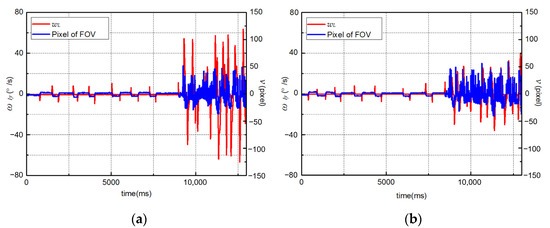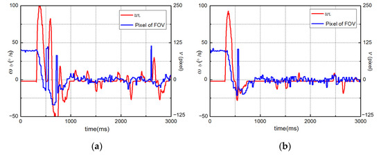 Situation 2: The system with a step in the visual input is implemented that completes the process to capture, and the trajectories of the angular velocity and the tracking error in pixels are shown in Figure 11. It has a bias in the pitch between the target and the center of the FOV, which is about 100 pixels. The system is running initially with the inner angular velocity loop and then switches to the outer visual loop at 0.3 s. The target is identified in a dark illumination during the process to capture, and the identified disturbance is dv = 25 in each test. As shown in Figure 11a, the angular velocity of the LOS is stable after 1 s, and the process to capture is between 0.3 s and 1 s. As a contrast, in Figure 11b, which show the results of the LADRC test, the process to capture is between 0.3 s and 0.75 s. The time during the capture is represented by tc, and the data of the test is shown in Table 5. The maximum overshoot in ωIy during the capture by the SMC is about 80°/s, which, as a contrast, is about −25°/s by the LADRC. There are random fluctuations in the stable process which are within ±30°/s by the SMC. By contrast, the more moderate fluctuations in ωIy are within ±20°/s by the LADRC. It proves that the VTISP with the LADRC can capture the target more stably in varying illuminations. The performance is better than the SMC, which has large fluctuations in the whole process.