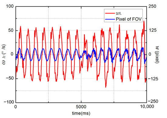 Situation 3: To test the dynamic performance of the VTISP with the LADRC controller in the tracking process, the target takes a pendulum movement in the yaw with the illumination and dark suited alternately. The trajectories of the angular velocity ωIz and tracking error w in the pixels are shown in Figure 12. During the tracking process in a suited illumination from 0 s to 5 s, the tracking error w is within ±30 pixels in the FOV. When the illumination is switching to darkness at 5 s, the VTISP is adjusted at 0.5 s to deal with the disturbance from the visual sensor. As illustrated in the trajectories of the test after 5.5 s, the maximum fluctuation in w is within ±15 pixels, and the target can be still tracked almost at the same performance. It is compared that the target has been lost when the disturbance in illumination is introduced to the SMC in a dynamic process testing. Therefore, we can conclude that the LADRC has a better dynamic performance in a VTISP system.
