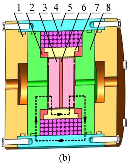 Schematic configuration of the enhanced radial MR valve: (a) Schematic diagram, (b) 3D diagram. 1. End cover, 2. Nonmagnetic ring, 3. Damping disk, 4. Excitation coil, 5. Valve body, 6. Nonmagnetic disk, 7. Magnetic ring, 8. Positioning plate.