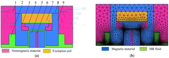 A 2D finite element model of the MR valve: (a) entity model, (b) meshed model. 1. End cover, 2. MR fluid, 3. Nonmagnetic ring, 4. Magnetic ring, 5. Damping disk, 6. Nonmagnetic disk, 7. Excitation coil, 8. Valve body, 9. Positioning plate.