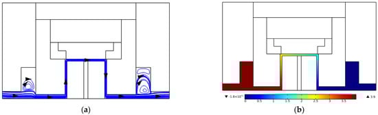 Figure 3a,b displays the velocity streamlines and the pressure variation in the MR valve when the applied current is 1 A, respectively. Observing Figure 3a, the streamlines in the damping channel of the MR valve are dense and straight, indicating that the flow velocity inside the channel is large and relatively stable. On the contrary, the streamline trajectories at both ends of the damping channel are complex and turbulent, indicating that the flow field at the entrance and exit of the channel varies dramatically. In Figure 3b, the internal pressure of the damping channel of the MR valve gradually decreases along the flow direction, and the pressure changes continuously without transient saltation.