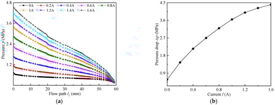 Pressure distribution in the damping channel under different currents: (a) pressure varies with flow path, (b) pressure drop varies with current.