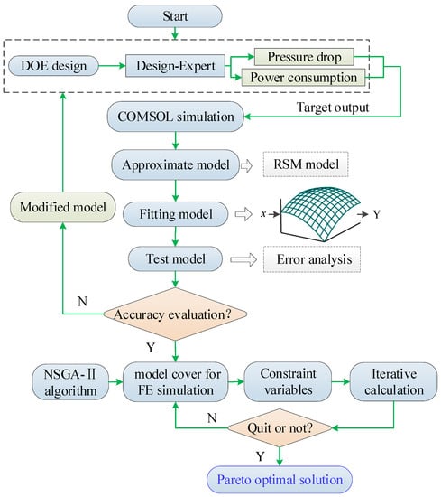 Based on the Design-Expert platform, the multi-objective optimization design of the MR valve was carried out by coupling the DOE orthogonal experiment analysis and the approximate model. The optimization process was demonstrated in Figure 6. Firstly, the finite element analysis had been sequentially executed on the training data of different level combinations of each optimization variable obtained from the orthogonal experimental analysis to calculate the pressure drop and power consumption of the proposed MR valve. Then, the response surface technology was subsequently employed to fit the second-order approximate model of each target response. In the meantime, the analysis of variance was utilized for estimating the interaction between the design variables and to verify the desirable variables which were having a significant influence on the response. Finally, the geometric optimization problem had been formulated for the approximate model exploiting the NSGA-II algorithm to find the Pareto optimal solution. As an aside, the optimum geometrical dimensions were selected from the solution set according to the actual situation.
