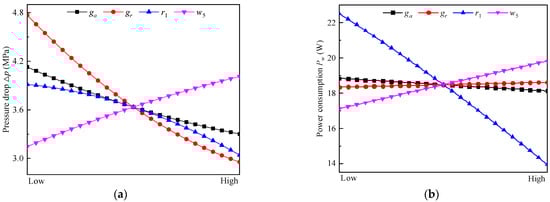 Main effect diagram: (a) design variables on Δp, (b) design variables on Pw.