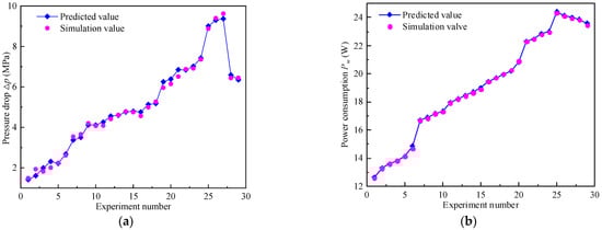 In order to comprehend the fitting effect of the constructed approximate model more explicitly, the predicted values of the approximate model are compared with the simulated values of the finite element model, which are portrayed in Figure 8. It is noted that the predicted values of the pressure drop Δp and power consumption Pw can well approximate the simulated values, which demonstrates that the approximate model built by the RSM can accurately reflect the actual simulation in the whole range of design variables.