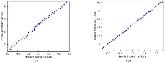 To examine whether the data points come from a normally distributed population, a normality examine is performed. Figure 9 reveals the standard residuals plotted against the percentage probability distributions of the pressure drop Δp and power consumption Pw. It can be clearly observed that the residuals data points closely follow the reference normal distribution line, which confirms that the analysis data from the population of normal distribution.