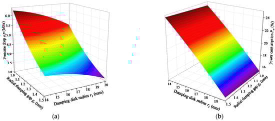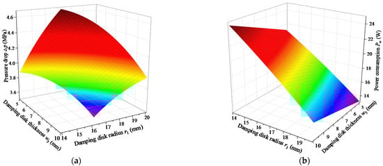 Figure 10 depicts the fitting surface of the model when the annular damping gap and the thickness of the damping disk remain unchanged. It can be directly observed that the pressure drop Δp and power consumption Pw reduce with increment of the radius of the damping disk. Nevertheless, the Δp increases with the decrease in the radial damping gap, and the radial damping gap has little influence on the Pw. As an aside, Figure 11 reveals the fitting surface of the model when keeping the radial damping gap and the annular damping gap unchanged.