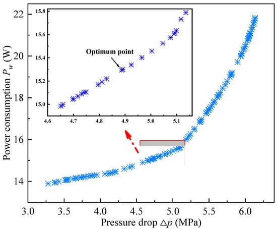 On the other hand, an m file containing the approximate model of pressure drop Δp and power consumption Pw is established in Matlab software, and the m file is solved by multi-objective optimization utilizing the NSGA-II algorithm. In the optimization, the objective is to maximize pressure drop and minimize power consumption. Moreover, the population size was set as 100, the maximum evolution algebra was set as 200, and the crossover rate, crossover distribution index and mutation distribution index were set as 0.9, 10, and 20, respectively. At last, 700 Pareto optimal solutions can be obtained by running the solution, and the distribution of the Pareto fronts is displayed in Figure 12.