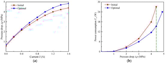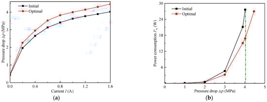 Figure 13 implies the comparison curves of pressure drop and power consumption for the initial and optimal MR valve. It is found that the pressure drop and power consumption of the optimal MR valve at each current are greater than those initial, and the differentials between them linearly enhanced with the increment of current. Meanwhile, at an applied current of 1.6 A, the performance indicators, such as the pressure drop and power consumption, increased significantly with the optimal values of 4.84 MPa and 15.26 W separately, when compared to 4.4 MPa and 27.1 W of their respective initial values. In consequence, the simulation optimization results indicate that the performance indicators of the optimal MR valve have a substantial improvement, which preliminarily verifies the effectiveness of the optimization design in this study.