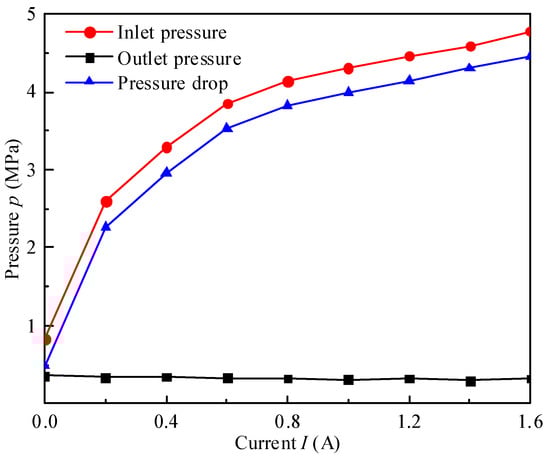 Figure 16 portrays the variation curve of the pressure of the optimal MR valve with current under load case 0. It is obvious that as the applied current enhances, the inlet pressure and pressure drop are growing in the same upward trend, while the outlet pressure remains basically unchanged. The maximum pressure drop of the proposed MR valve can reach about 4.46 MPa at the current of 1.6 A.