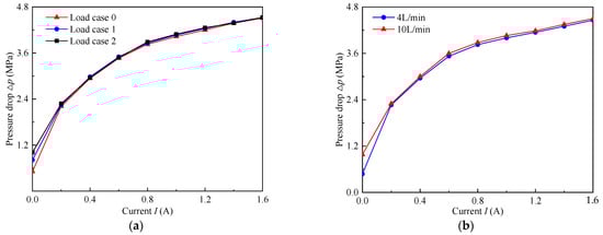 Figure 17 shows the variation of pressure drop of the optimal MR valve with load cases and flow rates. It was observed that the viscosity pressure drop of the optimal MR valve rises with the increment of the load under different load cases. The total pressure drop of the optimal MR valve is not affected by load changes based on different currents. In addition, the pressure drop when the flow rate is 10 L/min is larger than that of 4 L/min under each current, and the difference between the two pressure drops is quite small. Among them, the pressure drop deviation at 4 L/min and 10 L/min varies from 0.05 MPa at 0.8 A current to 0.04 MPa at 1.6 A current, respectively.