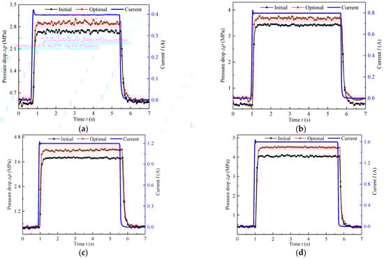 Pressure drop change of the initial and optimal MR valve under different currents: (a) 0.4 A, (b) 0.8 A, (c) 1.2 A, (d) 1.6 A.