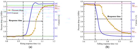 In order to investigate the dynamic response time of the enhanced radial MR valve, a square wave control signal was activated under a steady flow. Additionally, the data acquisition device could periodically collect the pressure drop and response time data of the initial and optimal MR valve, and the dynamic response time of the MR valve needs to consider the current step response time generated before the pressure drop response time, which was since the current and pressure drop were part of the same test system. In this article, the rising response time was defined as the time required for a system property to rise from its initial state to 95% of its maximum value. Conversely, the falling response time was defined as the time required for a system property to fall from its initial maximum state to 5% of its maximum value, which was displayed in Figure 19.