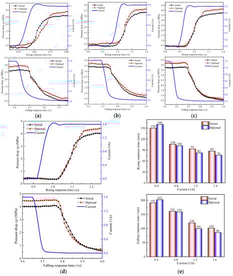 Dynamic response times in rise and fall phases of the initial and optimal MR valve: (a) 0.4 A, (b) 0.8 A, (c) 1.2 A, (d) 1.6 A, (e) response time.