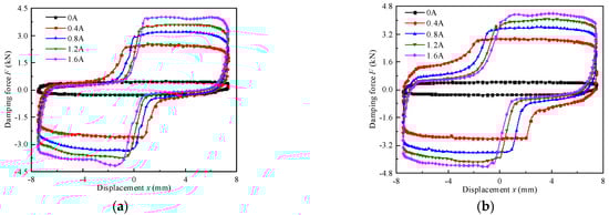 Figure 24 shows the measured damping force versus the displacement of the initial and optimal MR valve controlled hydraulic cylinder system at a frequency of 0.25 Hz and an amplitude of 7.5 mm. It can be distinctly noticed that the output damping force of the initial and optimal MR valve-controlled cylinder system stringent enhance with the increment of the excitation current. The main reason is that the increment of the excitation current will lead to the increase in the field-dependent pressure drop in the valve, which will enhance the damping force in the valve-controlled cylinder system. Additionally, the curve presented in Figure 24 has some distortion and missing in the upper left and lower right parts, which is mainly due to the fact that a certain volume of air is mixed into the MR fluid during fluid filling, resulting in a small empty stroke of the valve-controlled cylinder system due to the failure to timely compensate for the missing fluid in the chamber during the up and down stretching process. When the excitation current is 0.8 A, the maximum damping force of the initial and optimal MR valve-controlled cylinder system are 3.18 kN and 3.55 kN, the maximum deviation of calculation results for the initial and optimal output damping force is 11.62%.