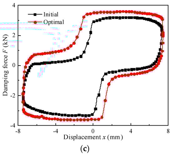 Damping force versus displacement at constant frequency and amplitude: (a) initial, (b) optimal, (c) comparison of the initial and optimal damping force.