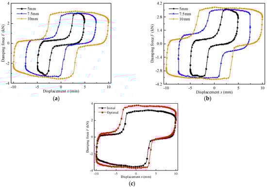 Damping force versus displacement at constant amplitude and current: (a) initial, (b) optimal, (c) comparison of the initial and optimal damping force.