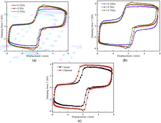 Damping force versus displacement at constant current and frequency: (a) initial, (b) optimal, (c) comparison of the initial and optimal damping force.