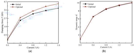Dynamic performance of the initial and optimal MR valve-control cylinder system at variable currents: (a) damping force, (b) dynamic range.