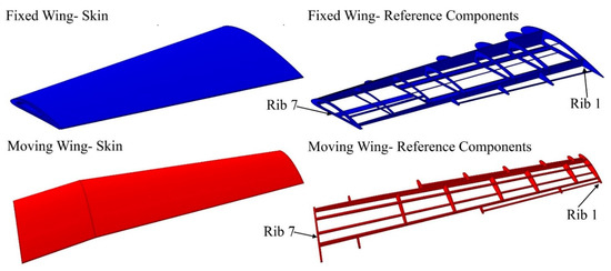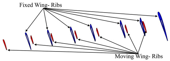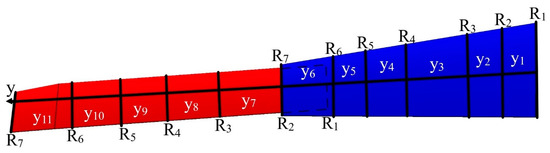 As following the initial topology optimization, the number and type of wing components and their positions were determined. Each wing segment was designed with two spars, seven ribs, and several support components that were developed from the earlier optimization process, as seen in Figure 2 [37]. Al 2024-T3 was selected for all components during the following topology optimization process to reduce the wing structures’ weight. The lifting load along the wingspan can be effectively estimated for each segment and it was calculated using the Prandtl lifting-line theory. The main parameters of the wing’s span and ribs could then be determined. As shown in Figure 2, the initial topology optimization recommended the positioning of the seven ribs within the moving wing and fixed wing segments in the suggested locations [37]. The MVSTW was divided into 11 separate parts according to the locations of the ribs (each wing segment has 7 ribs) when the wingspan was extended to 75% of the original length of the wing, as depicted in Figure 4.