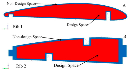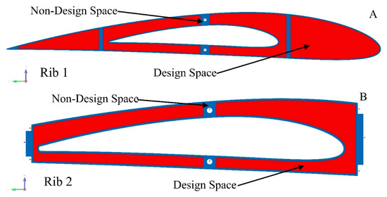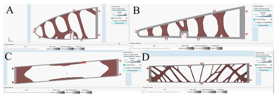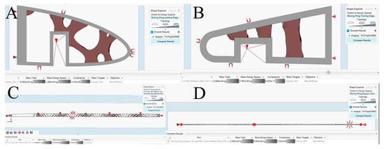 As a result of the TO, the compliance of static structural stiffness is entirely converted to potential deformation energy [54]. The static stiffness of a structure can be determined using Finite Element Analysis (FEA). The design field’s material distribution is optimized by the STO SolidThinking Inspire solver for TO and by the OptiStruct solver for sizing optimization; the latter utilizes algorithms to obtain the shape of the best possible wing components. These two optimizations’ strategies determine the best possible solutions for wing components’ compliance under set boundary conditions, considering the design constraints to minimize their weights.