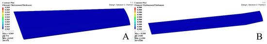 Aerodynamic loads were used, and their design variables were considered as scalar parameters in the optimization computations. In this investigation, these parameters were determined to solve the optimization problem, as the thickness of the wing skin affects the system’s responses. Design volume and set of the stresses were the variables applied to the optimization responses. The objective function was set to decrease the structural components’ weights of the wing skin. The lower and upper bounds of the maximum stress values were given as the design constraints. Therefore, the design parameter of the maximum stress response was selected as 750 MPa. The design variable was given an initial value of 2 mm, as well as a lower and upper bound of 0.5 and 2 mm, respectively [58,59]. The following formulation was used to describe the optimization problem: