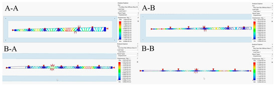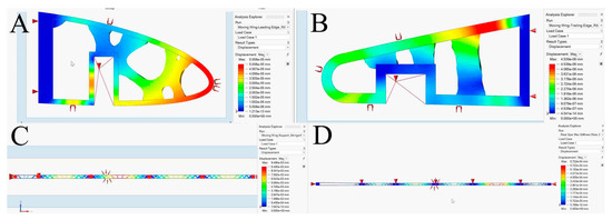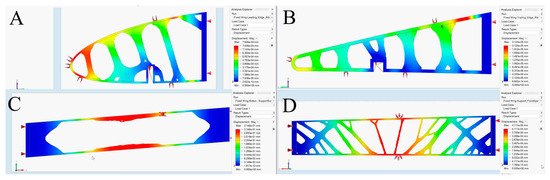 The structural design’s discrete TO aims to minimize weight while maximizing stiffness and decreasing structural compliance. Thus, applying static loading on each wing component yields static stiffness (for both segments). The mechanical resistance to displacement represents the value of the produced deformation under static load [52]. Based on the displacement, the stiffness can be calculated mathematically as: