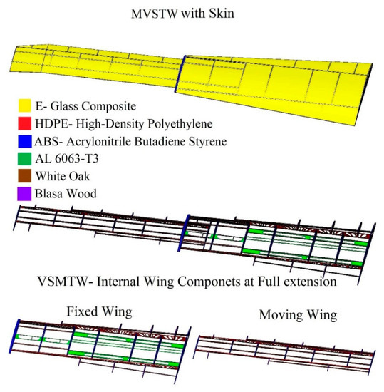 A number of studies conducted in Aerospace Research Centers have proven the advantages of wing shape morphing. The LARCASE has accomplished many investigations of the Unmanned Aerial Systems UAS-S4 and UAS-S45 and other projects. The main objective of these investigations is to improve the aerodynamic performance and enhance green aircraft technology [29,30]. These earlier works investigated the multidisciplinary numerical optimization of MVSTW, which integrated automated numerical analyses of aerodynamics, Finite Element Method, and structure optimizations [31]. Aerodynamic analyses have established that increasing the wing area via the span-morphing technique improved its aerodynamic performance, reduced fuel consumption, and increased flight envelope range [32,33,34]. Another advantage was the ability to dominate roll control using the asymmetric wingspan mechanism rather than conventional control surfaces [35]. Design engineers face the most significant challenge, which is the structural wing weight penalty. To overcome this challenge, structural optimization is considered the most successful technique for weight minimizing by enhancing the structural design and development of the wing. An optimized reference wing was developed based on multidisciplinary numerical optimization consisting of aerodynamic optimization, the Finite Element Method, and structural optimization (topology and sizing) [31,36]. The aerodynamic optimization was combined with topology optimization results to allocate the wing components within MVSTW segments [35]. The topology and sizing optimization were then repeated for the entire component set using a single material (aluminum alloy-2024-T) to minimize the wing component weight [31].