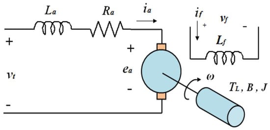 The mathematical model of the SEDCM is realized by the relationship between the electrical and mechanical circuits. The SEDCM has armature and field windings, which are separately excited by two DC sources. When the voltage from the two DC sources is applied, the armature current and field current flow through the circuits. To develop a back EMF and torque at a certain speed [3,13,14]. Figure 1 illustrates the equivalent circuit of the SEDCM with armature windings, field windings, and the mechanical system.